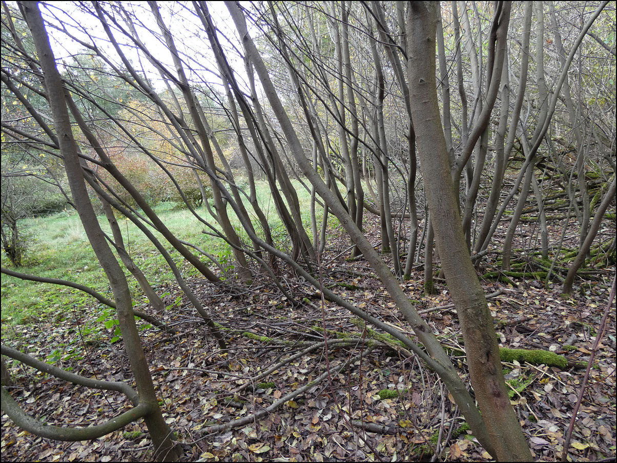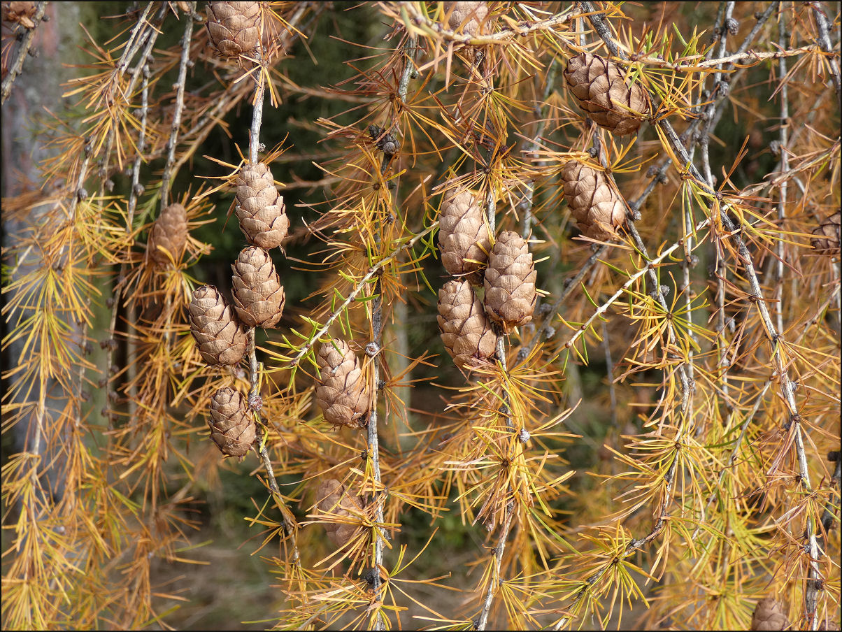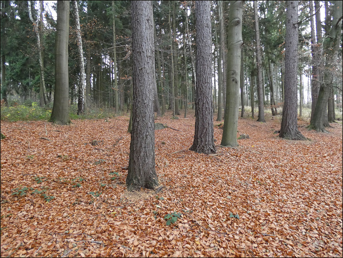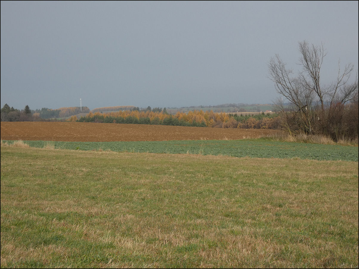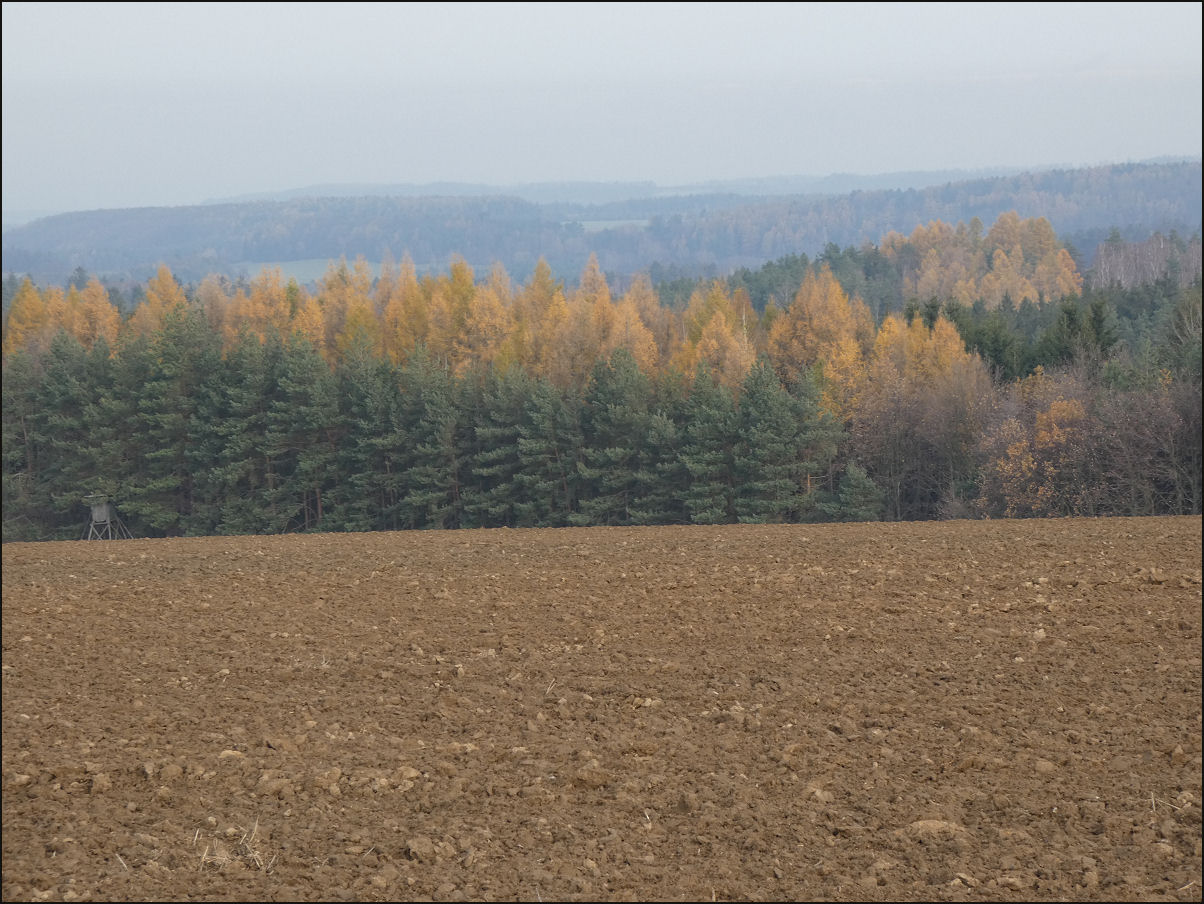 Modříny (Larix decidua) jsou na konci podzimu vybarvené, jehlice stále setrvávají na stromech (Otradov-okraj lesa Kablaně, 11/2025).