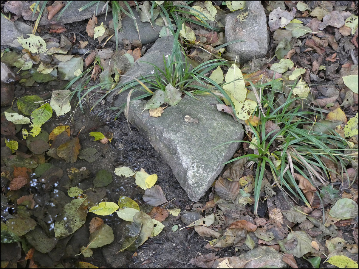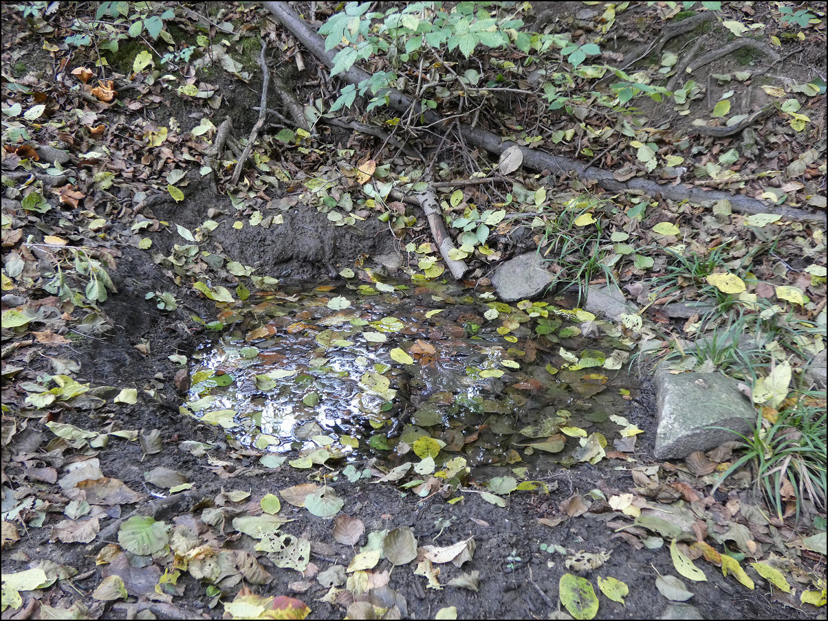 Voda nepřetéká. Narůstající spad listí je v této době podpořen krátícím se dnem a občasnými ranními mrazíky (10/2025).