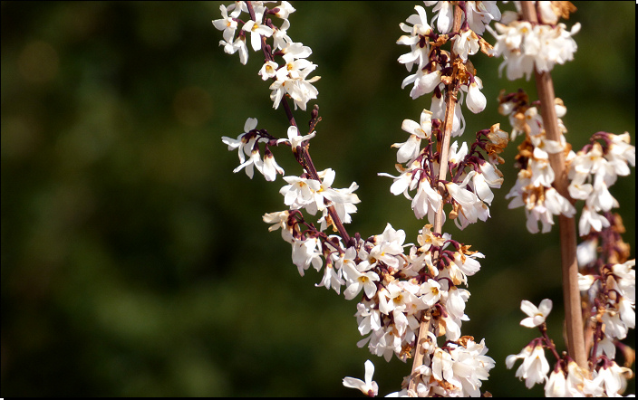 Křovitá, rozložitá dřevina původem z horských svahů korejských hor. V Evropě se pouze pěstuje v parcích a zahradách, zejména pro své brzké kvetení již v předjaří. Květy jsou bílé, tvarem velmi podobné žlutokvětým keřům rodu Forsythia. V ČR je plně mrazuvzdorný, preferuje slunci exponovaná místa chráněná před mrazivými větry.